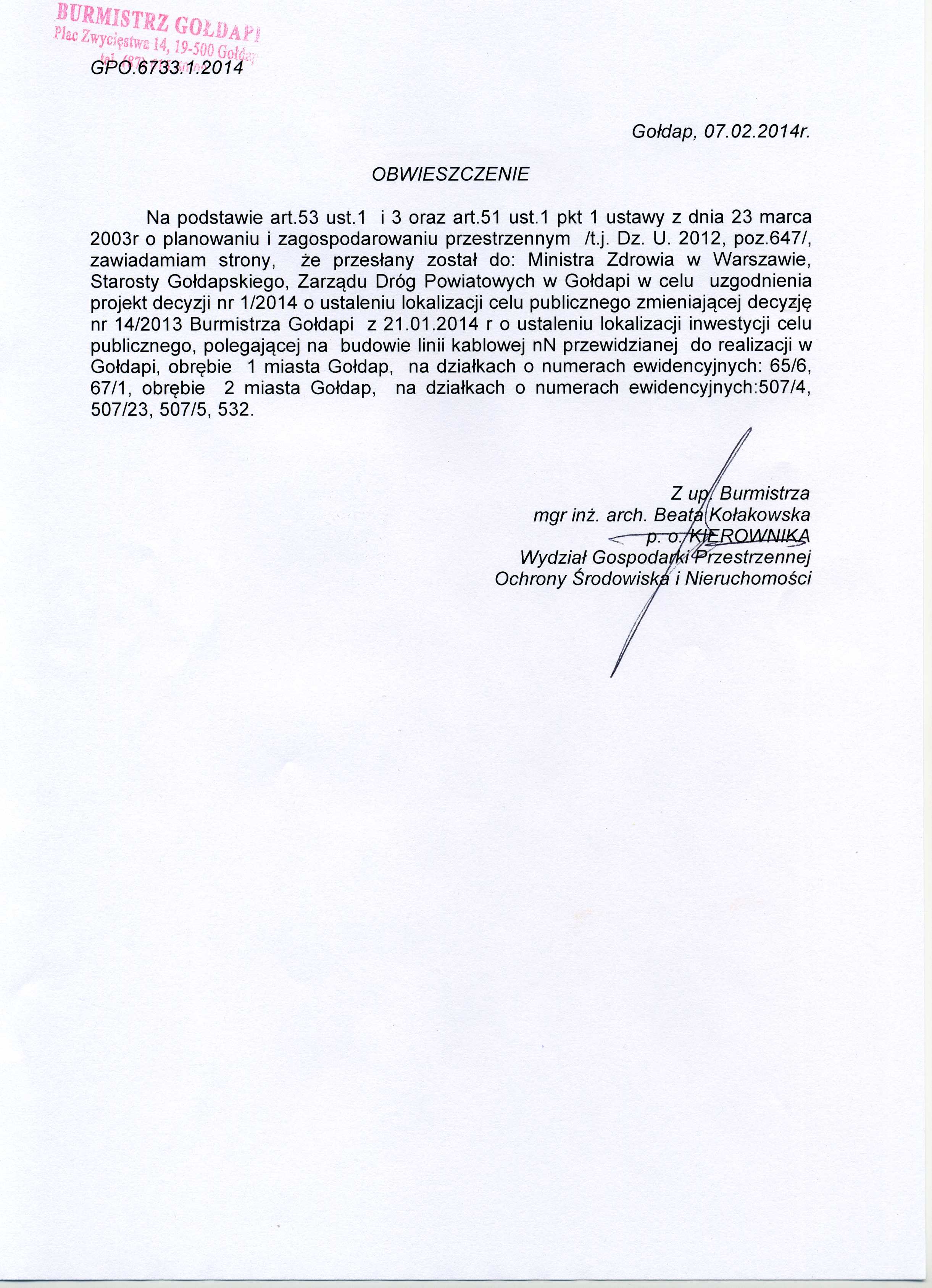 Obwieszczenie - o wysłaniu do uzgodnienia projekt decyzji nr 1/2014 o ustaleniu lokalizacji celu publicznego zmieniającej decyzję nr 14/2013 Burmistrza Gołdapi z 21.01.2014 r .