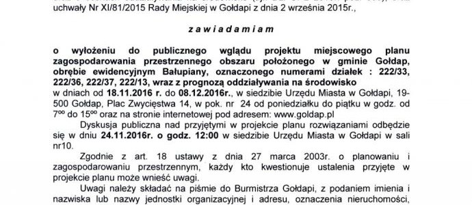 Ogłoszenie o wyłożeniu do publicznego wglądu projektu miejscowego planu zagospodarowania przestrzennego obszaru położonego w gminie Gołdap, obrębie ewidencyjnym Bałupiany, oznaczonego numerami działek : 222/33, 222/36, 222/37, 222/13.