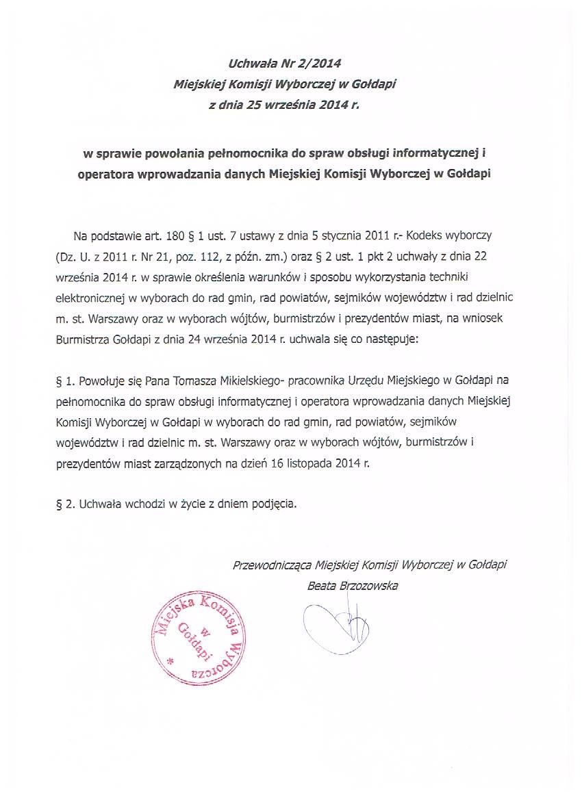 Uchwała nr 2/2014 Miejskiej Komisji Wyborczej w Gołdapi z dnia 25 września 2014 roku w sprawie powołania pełnomocnika do spraw obsługi informatycznej i operatora wprowadzania danych Miejskiej Komisji Wyborczej w Gołdapi
