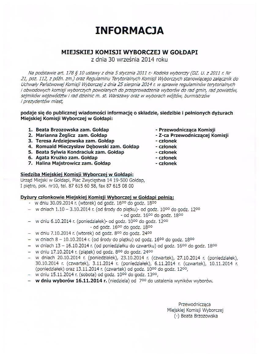 Informacja Miejskiej Komisji Wyborczej w Gołdapi o składzie, siedzibie i pełnionych dyżurach Miejskiej Komisji Wyborczej w Gołdapi - uaktualniona
