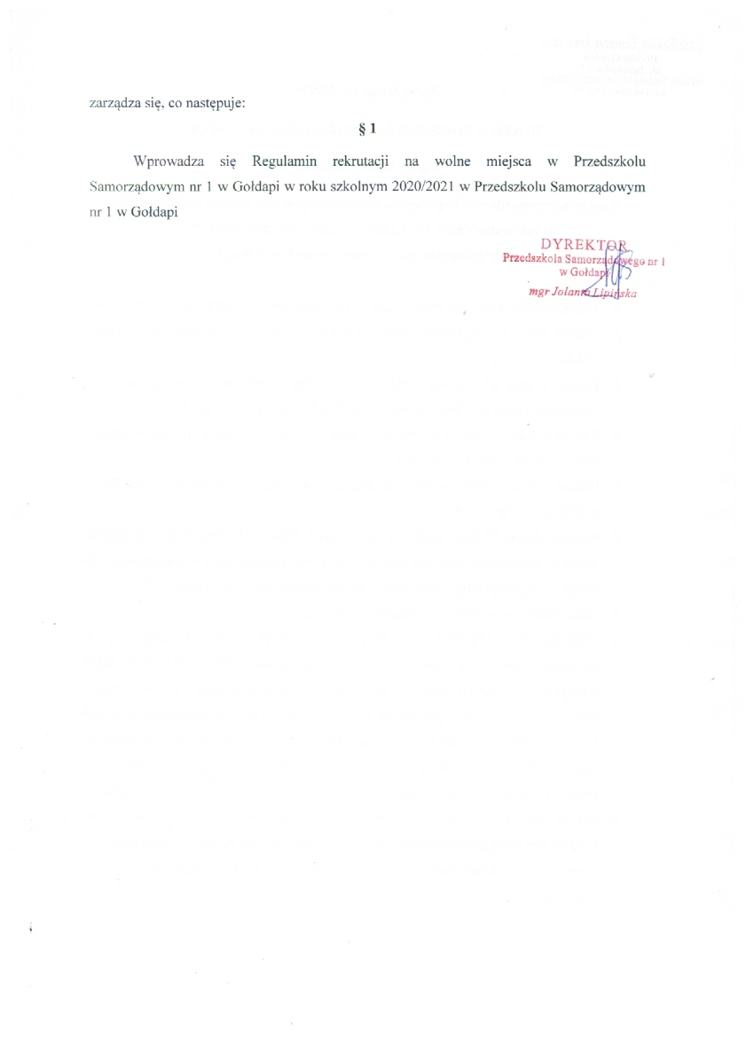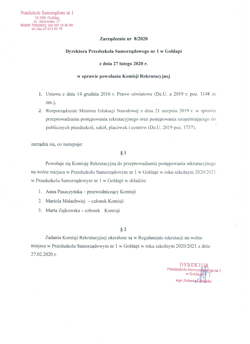 - Regulamin rekrutacji jest załącznikiem nr 1 do Zarządzenia Dyrektora Przedszkola Samorządowego nr 1 w Gołdapi z dnia 27 lutego 2020 r.