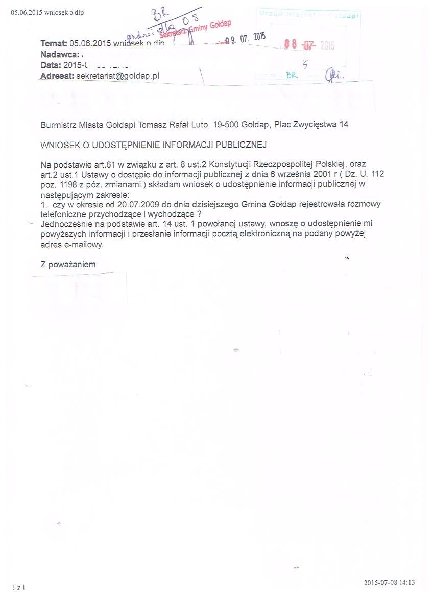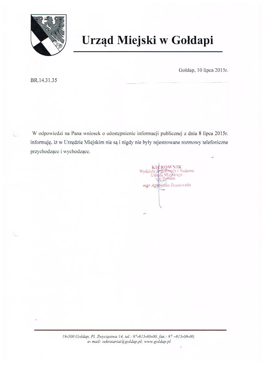 BR.1431.35.2015 - Wniosek o udostępnienie informacji publicznej dot. rejestracji rozmów tel.w urzędzie