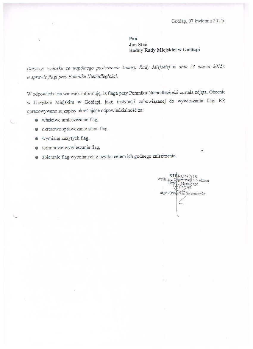 wniosek z posiedzenia komisji z dnia 23 marca 2015r. w sprawie postępowania z symbolami narodowymi m.in. flagi przy Pomniku Niepodległości