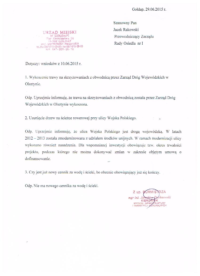wnioski zgłoszone na sesji w dniu 10.06.2015r. w spr.:wykoszenia trawy na skrzyżowaniu z obwodnicą, usunięcia drzew przy ul.Wojska Polskiego i nowego cennika za wodę
