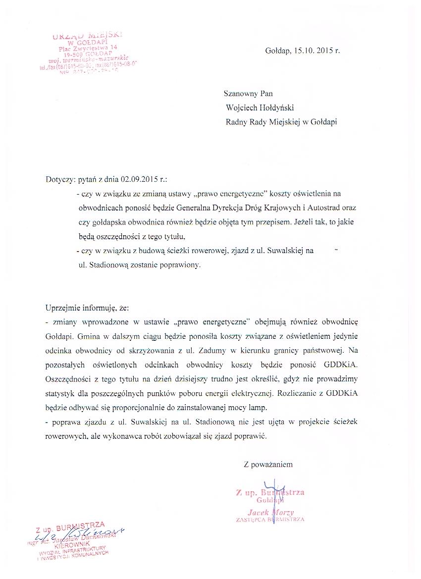 zapytania zgłoszone na sesji Rady Miejskiej w dniu 2.09.2015r. w sprawie:1) ponoszenia kosztów oświetlenia gołdapskiej obwodnicy po zmianie ustawy "prawo energetyczne",2) naprawy zjazdu z ul.Suwalskiej na ul.Stadionową.
