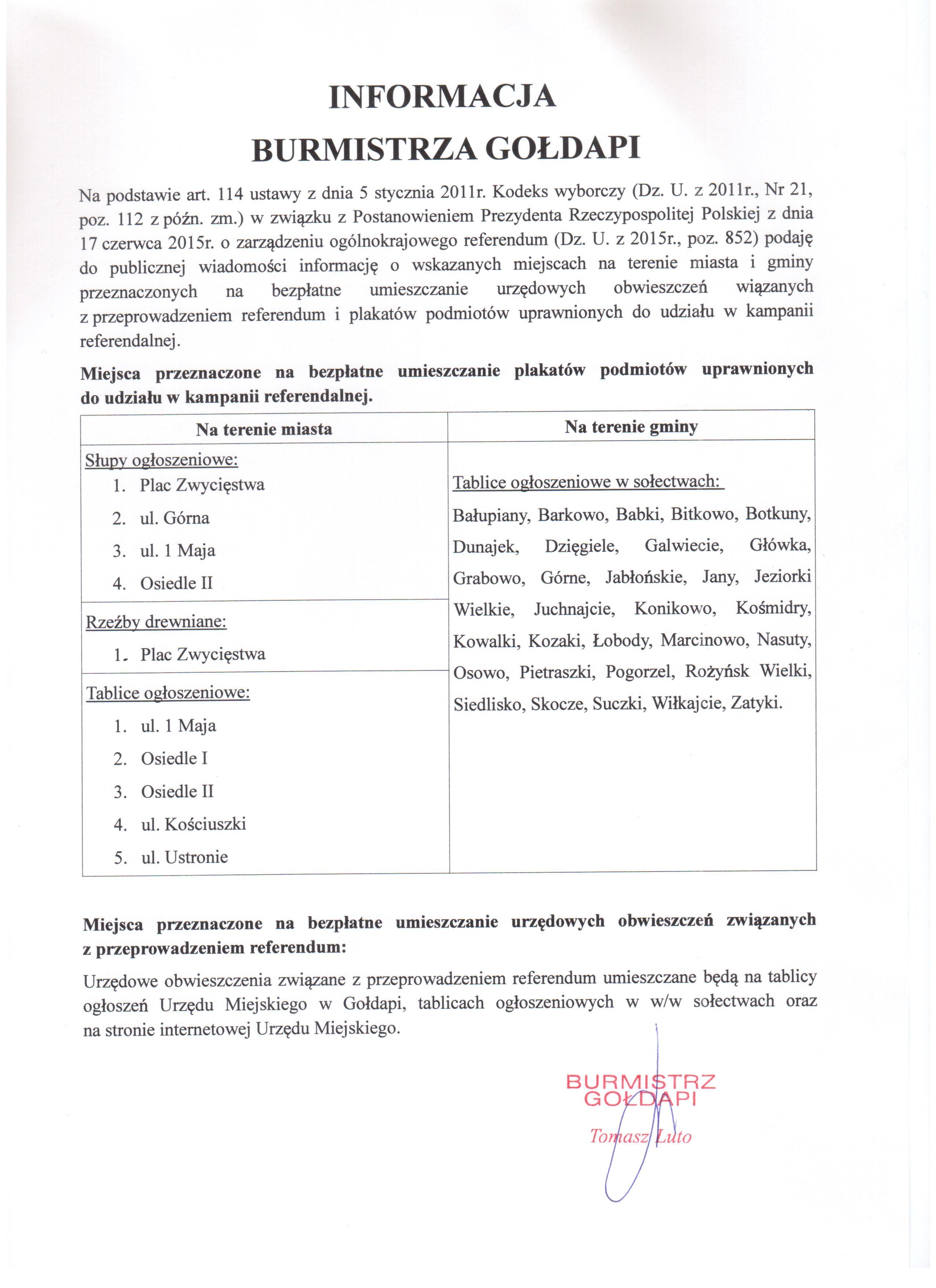 Informacja Burmistrza Gołdapi o miejscach na terenie miasta i gminy przeznaczonych na bezpłatne umieszczanie urzędowych obwieszczeń związanych z przeprowadzaniem referendum i plakatów podmiotów uprawnionych do udziału w kampanii referendalnej