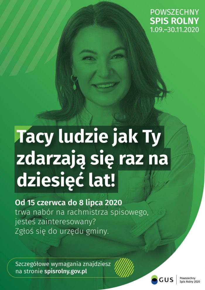 Na podstawie art. 20 ust. 4 ustawy z dnia 31 lica 2019 roku o powszechnym spisie rolnym w 2020 roku (Dz. U. poz. 1728) podaje się do publicznej wiadomości informację o naborze kandydatów na rachmistrzów terenowych do spisu rolnego na terenie Gminy Gołdap. Powszechny spis rolny odbędzie się w dniach od 1 września 2020 r. do 30 listopada 2020 r.